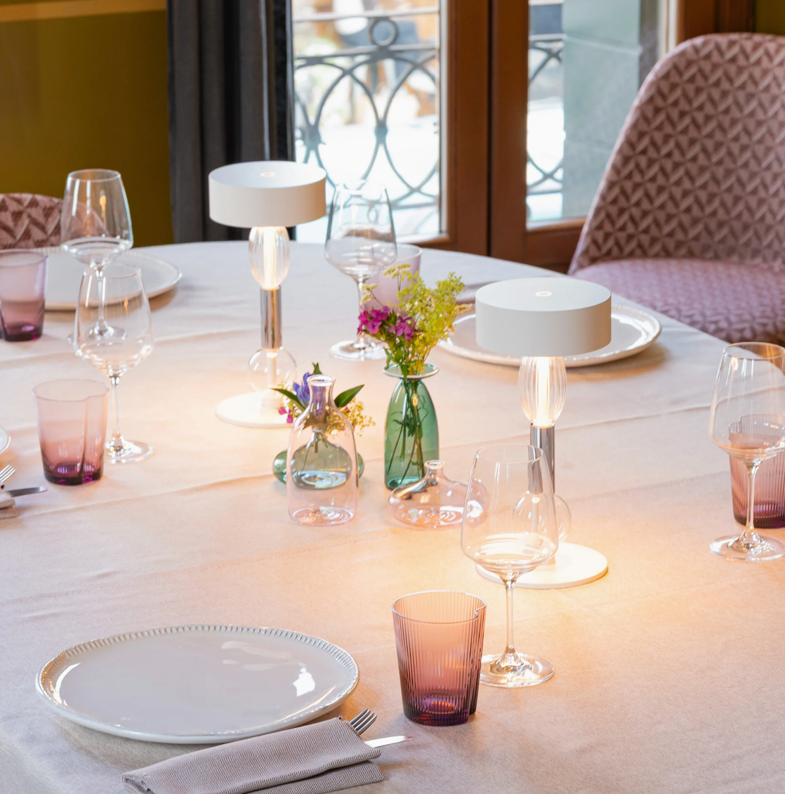 Designed by Lucchesedesign, the Royal Family Wi-Fi cordless, rechargeable battery lamp blends refined aesthetics and innovative technology in a luminous decorative object. This LED table lamp features touch control and 2.4 GHz Wi-Fi connectivity for remote control via app, with optional offline use in standard mode. The painted aluminum structure is enhanced with hand-blown borosilicate glass elements and a prismatic polycarbonate diffuser, creating refined and atmospheric lighting effects. The dimmable LED system allows you to choose between four color temperature settings (2200K, 2700K, 3000K, 4000K) and adjust the light intensity. Equipped with a contact charging base (included), the Royal Family Wi-Fi lamp runs on a rechargeable and replaceable lithium battery, offering up to 36 hours of autonomy depending on usage, and fully recharges in approximately 5 hours. The USB charger is sold separately. With an IP65 protection rating, this lamp is also suitable for outdoor use (except for the gold leaf version, for which continuous outdoor use is not recommended). Available in matte white, titanium, and gold leaf finish, it’s the perfect choice for those seeking a sophisticated, connected style—ideal for residential or contract settings.
